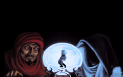 Everyone starts to fight, but it would take to long to defeat these mirrored versions and in the last minuet the thief backstabs my shadow and hands me some pills and tells me to go onward. I'm now confronting the demon summoner who tries to bring all demons through the portal with the use of a magic crystal. I summon my staff and fires a Bolt in his back. He Fetch my staff, but I remember what Rakeesh's wife told me when I created the staff, don't Trigger it since it would unleash all the magic within it. So that's exactly what I do and the the staff explodes in his hand and he is unmade. AWESOME! But the portal is still up and I need to destroy it. And here is where the game seems to glitch out on me. I tried to throw a Lightning Bolt on the crystal, but it got sucked up. At that point it wouldn't allow me doing anything else and my cursor was stuck as a scarab. So I had to reload. I guess it was supposed to show the failure screen, but somehow it didn't work. Not the first time it craps out. Several times when exiting an area the hero turns back to the previous screen without me doing anything and when I returned to Tarna the sun just wouldn't set even though it was in the middle of the night. Lastly when I "bought" Johari the tribal chief seemed to get a stroke cause he constantly wondered what I was doing in his hut and the game wouldn't let me leave. I might not have cared so much if the last game didn't play so well, but is not actually fair since that game was made in the 2000's and not released until they were happy with it while this game probably had a deadline. Anyway, I destroy the crystal with a Flame Dart since that one was maxed out and I return to my friends who all survived the ordeal. They all celebrate when dark magic suddenly envelops me and we are shown a screen of Ad Avis with fangs and what must be his dark master. To Be Continued!